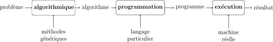 L’algorithmique permet ainsi de passer d’un problème à résoudre à un algorithme qui décrit la démarche de résolution du problème de manière valide et robuste, plus ou moins réutilisable, plus ou moins complexe et plus ou moins efficace selon son contexte d’exécution. La programmation a alors pour rôle de traduire cet algorithme dans un langage « compréhensible » par l’ordinateur afin qu’il puisse exécuter l’algorithme automatiquement.