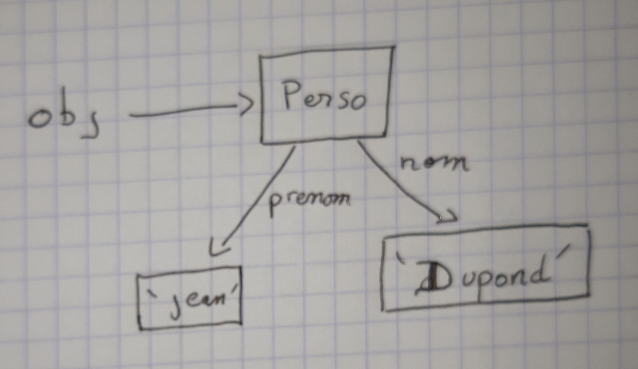 On représentera donc un objet par un rectangle contenant le nom de son type (= nom de sa classe). Sur chaque flèche pointant vers une donnée contenue par l’objet nous indiquons la clé. Ainsi il est possible de comprendre l’instruction