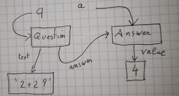 class Question : pass class Answer : pass r=Answer() e.value=4 q=Question() q.text="2+2?" q.answer=rCe code donnerait la représentation suivante :