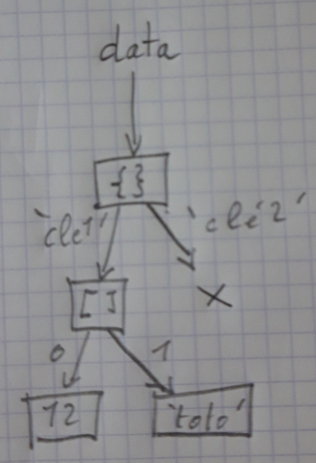 Vous pouvez représenter l’arbre de données correspondant à la variable data de la manière suivante. Comprenez vous le lien entre le code précédant et l’image suivante?