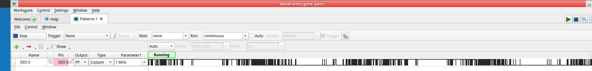 Cette configuration permet de générer un signal PDM à valeur moyenne sinusoidale 1kHZ sur DIO0 ( fréquence PDM 1 MHz )