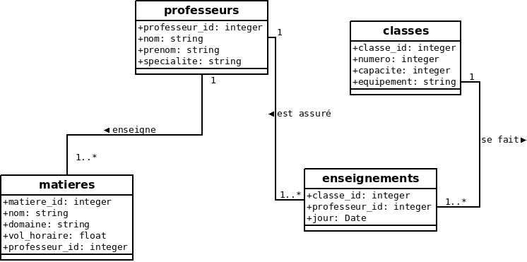 Une école souhaite mettre en place un Système d’Information sur les enseignements de matières par des professeurs dans des salles de classe.